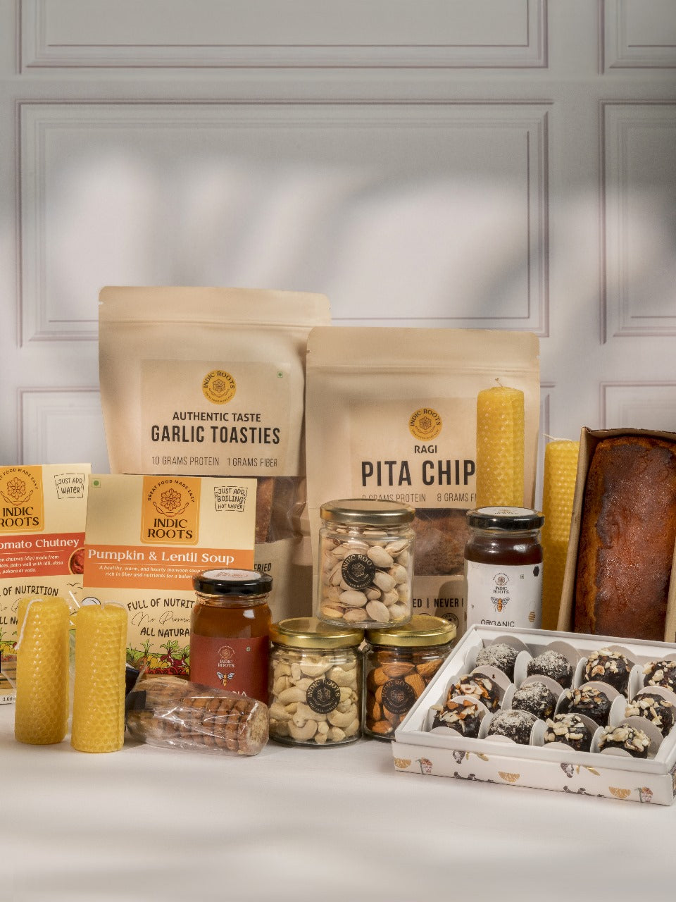 From Ragi/Millet Chocolate Laddoos to crunchy nuts and cozy soups, this hamper blends traditional favourites with modern festive treats. Perfect for gifting or enjoying with loved ones!