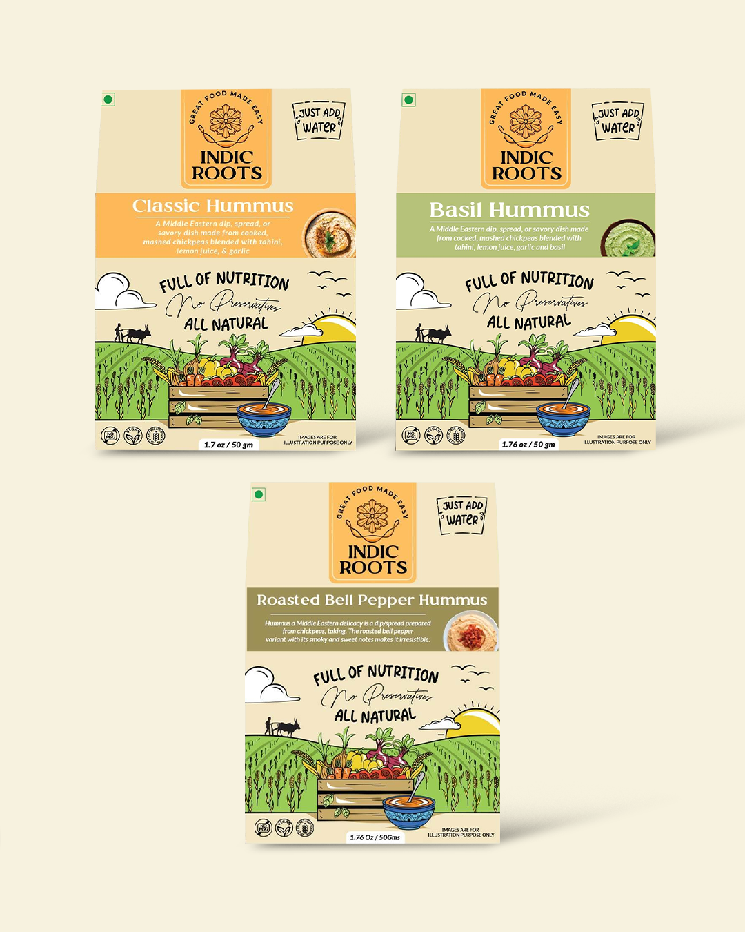 - Creamy blends made using chickpeas, sesame, and natural flavour ingredients
